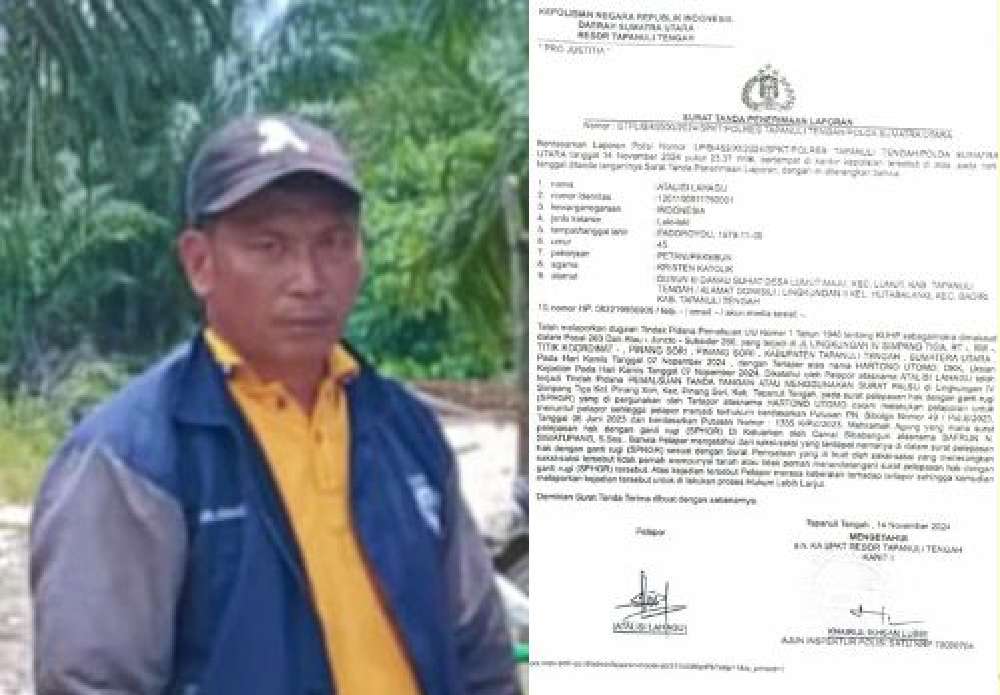 POLISI NEWS | TAPTENG. Direktur Utama PT. Fajar Indah Anindya (FIA), Hartono Utomo dilaporkan ke Polres Tapanuli Tengah oleh Atalisi Lahagu (45) atas dugaan tindak pidana pemalsuan, hal ini disampaikan oleh Atalisi Lahagu kepada sejumlah wartawan, pada Jumat (18/04/2025).