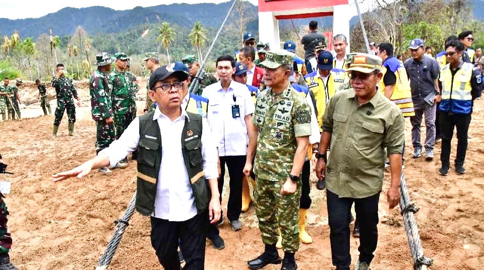 POLISINEWScom | TAPTENG. Kolaborasi Pusat dan Daerah Tinjau Pascabencana Banjir Tapanuli Tengah (Tapteng), Menteri Koordinator Bidang Pembangunan Manusia dan Kebudayaan (Menko PMK) Prof. Dr. Pratikno dan Kepala Staf Umum (Kasum) TNI Letjen TNI Richard Taruli Horja Tampubolon, didampingi oleh Bupati Tapteng Masinton Pasaribu, dan Wakil Bupati Tapteng Mahmud Efendi pada Jumat 13 Februari 2026, meninjau Jembatan Gantung Perintis Garuda di Kelurahan Tukka Kecamatan Tukka Kabupaten Tapanuli Tengah, Provinsi Sumatera Utara.