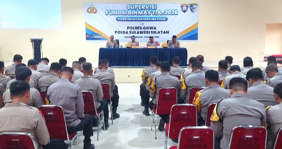 POLISINEWS.com| GOWA. Tim Supervisi Fungsi Binmas Tahun Anggaran 2026 Korbinmas Baharkam Polri melaksanakan kunjungan kerja di Polres Gowa, Selasa (31/3/2026). Kegiatan supervisi dipimpin langsung oleh Kabagopsnalev Korbinmas Baharkam Polri, Brigjen Pol Mochamad Khozin, S.H., S.I.K., M.H.